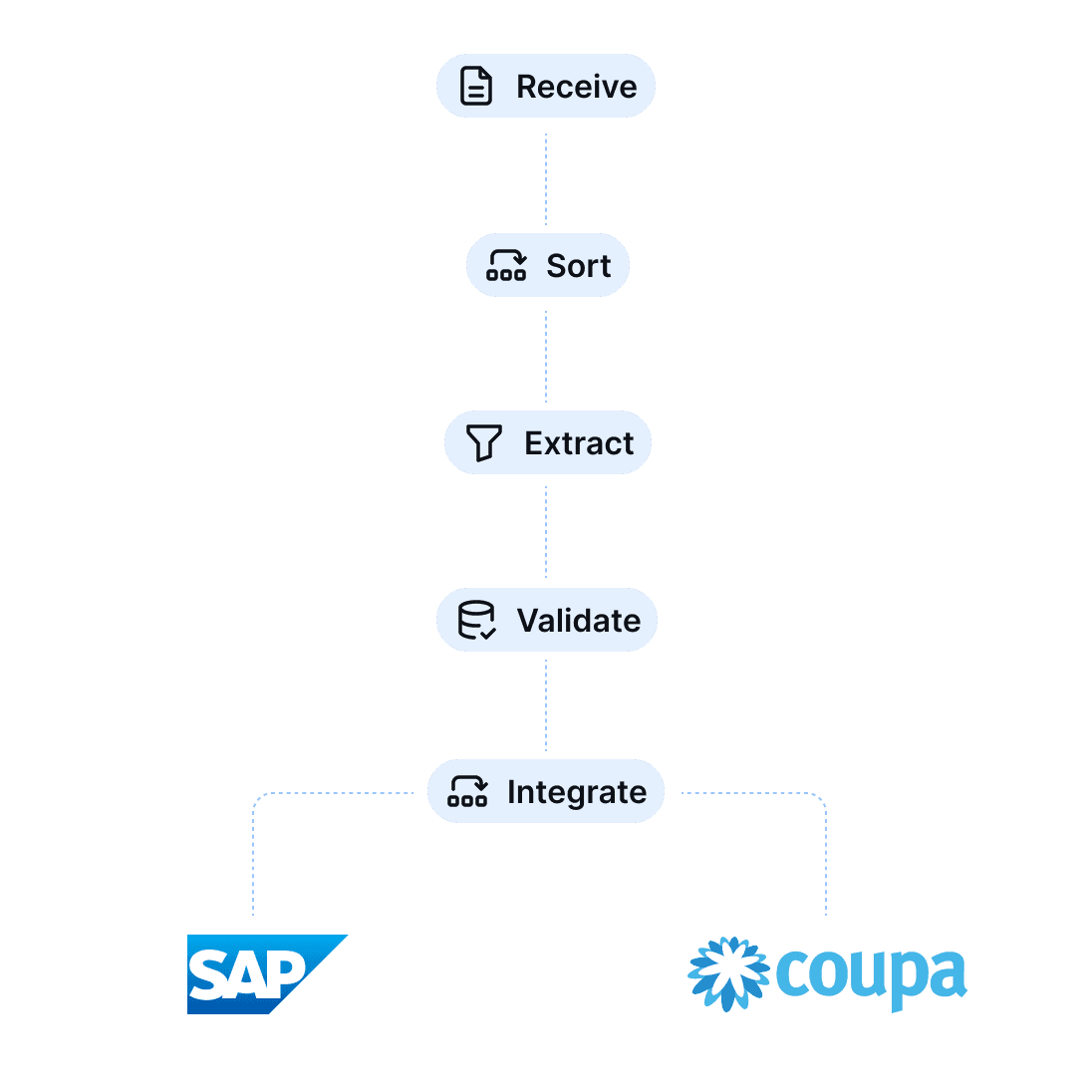 Receive - supplier invoices, purchase orders, delivery notes, and certificates are captured from email, EDI, or file uploads.
